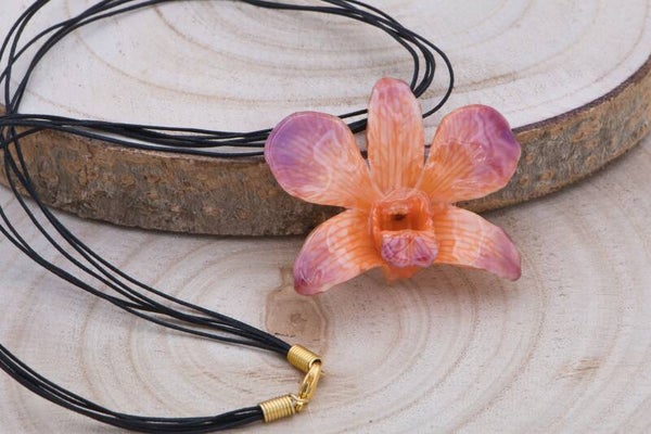 Der Orchideenanhänger wurde in einem besonderen Verfahren bearbeitet und mit transparentem Harz beschichtet, um die natürliche Schönheit und zarte Form der Blüte zu bewahren. Diese einzigartige Kombination aus der Pracht der Natur und handwerklicher Kunst schafft ein Schmuckstück, das sowohl die Sinne betört als auch für seine Trägerin oder den Beschenkten einen besonderen Wert hat.