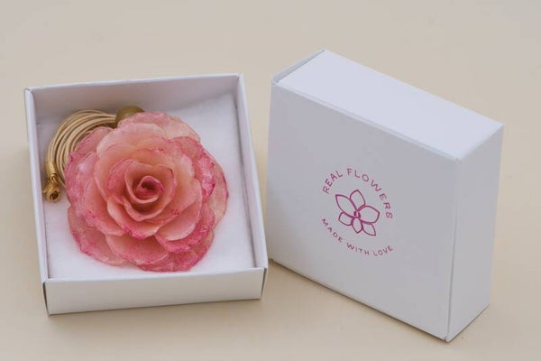 Die Rose, ein ewiges Symbol für Liebe, Jugend und Schönheit, wurde mit viel Liebe zum Detail in einem speziellen Verfahren bearbeitet und mit transparentem Harz versiegelt. So bleibt ihre natürliche Pracht für immer erhalten. Diese perfekte Verbindung von Natur und Handwerkskunst macht das Schmuckstück zu etwas ganz Besonderem.
