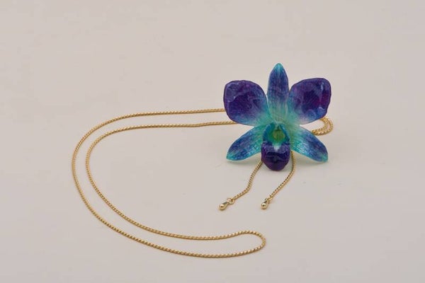 Handgemachte Halskette mit echter Orchidee in Harz – Lila Türkis Blüte – Verstellbare Kette – Floraler Schmuck – Geschenk für Frauen